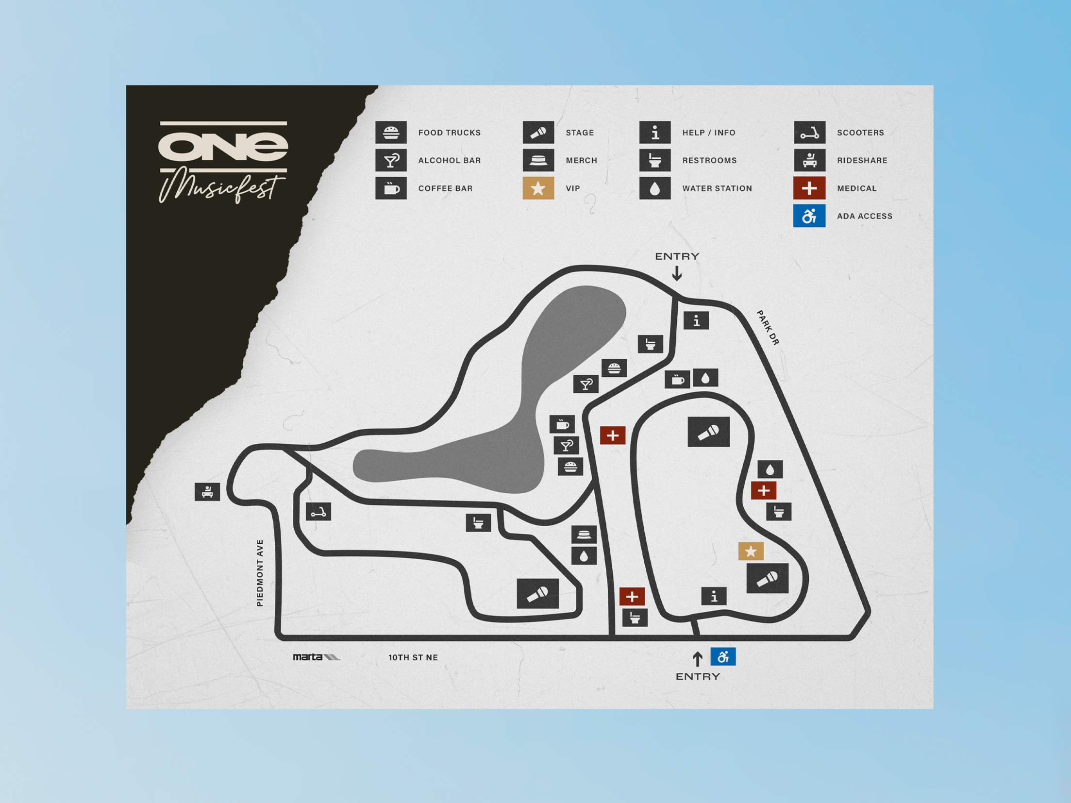 ONE Musicfest is an annual music festival held in Piedmont Park, Atlanta, where hip-hop, R&B, and soul come together to celebrate Black culture. This project focused on rebranding the festival and designing a wayfinding system that could support a large-scale, immersive experience.